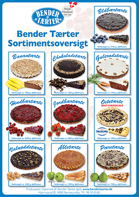 Der fremstilles kagetærter i 10 forskellige varianter, alle er bagt i porcelænsforme og fremstillet i hånden, helt ned til den sidste detalje. Alt foregår på gammeldags manér, præcis som da Bender Tærter startede. Du kan læse produktinformation, og optøningstider mm. på deres hjemmeside: bendertaerter.dk, eller lade dig friste af deres inspirerende kataloger nedenfor.